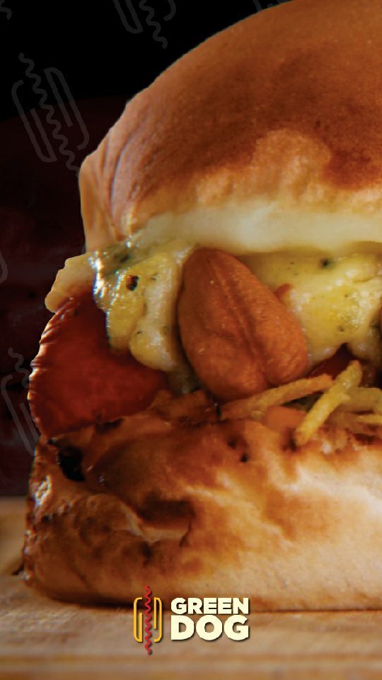Duas salsichas, Molho Greendog de mostarda e mel, gorgonzola, catupiry original, pão, milho, maionese e batata palha. Escolha o sabor da sua salsicha.